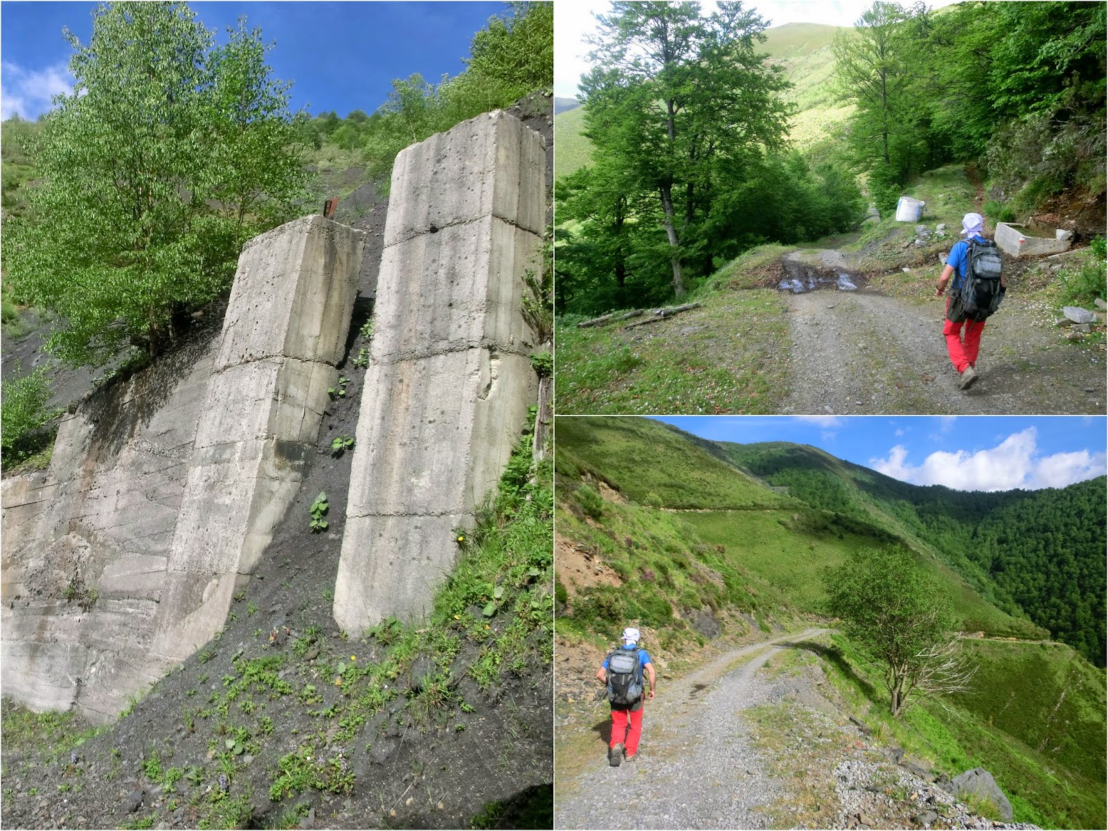 Esta pista de acceso a Piedrafita discurre, en parte, por la trinchera del ferrocarril minero que surcaba el Monte L.ladrones. Desde el promontorio de Piedrafita el minera descendía, mediante cable, a la cercana estación de Navidiello para su embarque en el tren