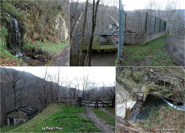 Después voy monte abajo hasta llegar a Les Estieḷḷes donde paso junto a una pequeña presa donde se capta agua para la central hidroeléctrica de Murias. Sigo adelante por las losas de hormigón armado que tapan la canal