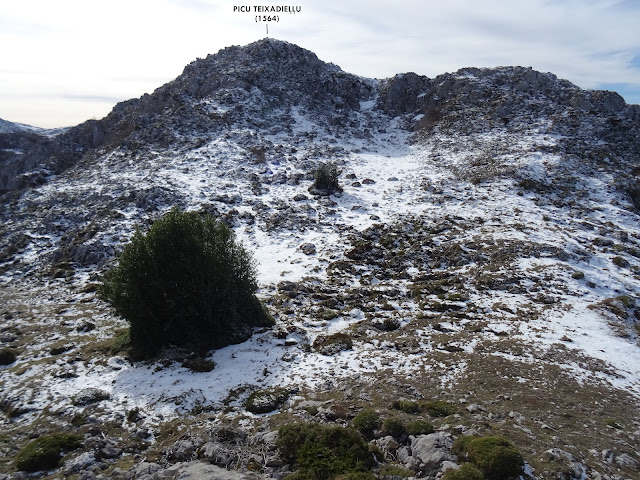 Sin grandes dificultades, a pesar de la nieve, alcanzo la cima de EL PICU TEIXADIEḶḶU (1564 m), nombrado en el IGN como el Pico de Zaraméu
